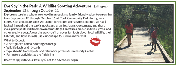 Explore nature in a whole new way! In an exciting, family-friendly adventure running through October 11 at Cook Park during park hours. Kids and adults alike will search for hidden animals (real and not-so-real!) tucked throughout the park’s nooks and crannies. Using clues, maps, and sharp eyes, participants will track down camouflaged creatures hidden in trees, grass, and other sneaky spots. Along the way, you'll uncover fun facts about local wildlife, their habitats, and how animals use camouflage to survive in the wild.