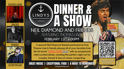 Experience an unforgettable evening celebrating the legendary music of Neil Diamond, brought to life with heart, soul, and stunning musicianship featuring National touring singer, pianist and Storyteller, Thomas Linsk. “Neil Diamond & Friends” is more than a tribute—it’s a shared night of storytelling, sing-along favorites, and timeless songs that span generations, all set against the cozy, waterfront charm of Lindy’s Landing.