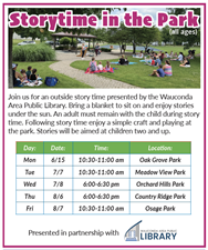 Join us for an outside story time presented by the Wauconda Area Public Library. Bring a blanket to sit on and enjoy stories under the sun. An adult must remain with the child during story time. Following story time enjoy a simple wooden craft and enjoy the park. Stories will be aimed at children two and up.